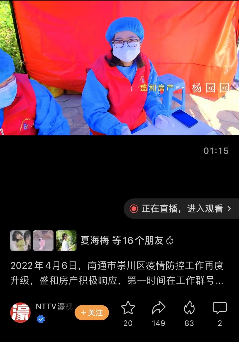 “我们公司72个人,都在社区帮忙做志愿者,也没有什么特别想说的,就是希望南通疫情快点过去,大家能够重返以前美好的生活。”这是公司综合管理部员工杨园园在红星社区核酸检测点做志愿服务时接受NTTV采访所说的话。——没有报酬,没有奖励,没有“研究”和“商量”,他们自觉自愿。他们是党员,是群众;是领导,是员工;是儿女,是父母;他们是44118太阳成城官方网房产志愿者。