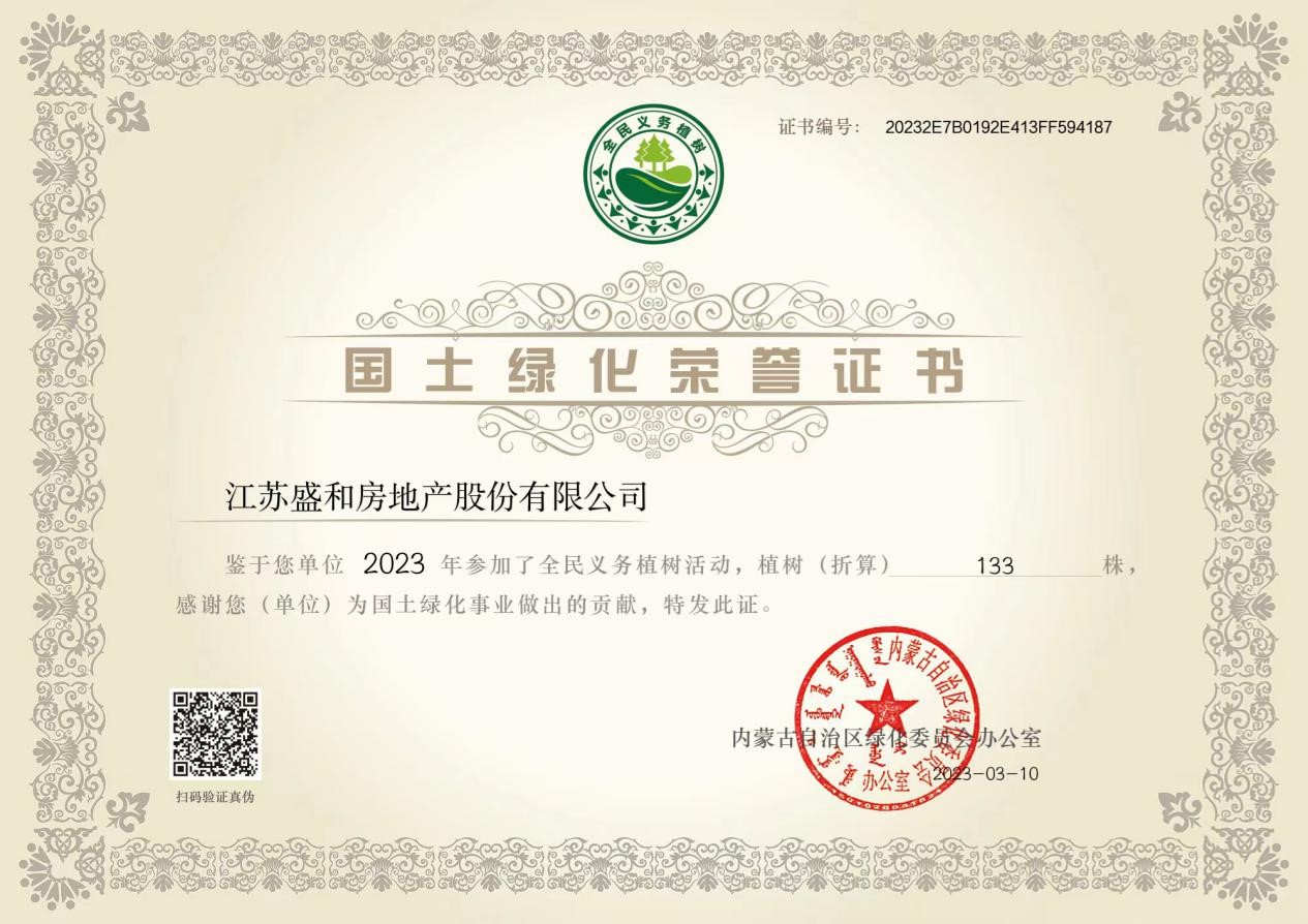 植树造林,绿化祖国,是我国的一项基本国策。今年,44118太阳成城官方网房产参与全民义务植树“献一份爱心 护沿黄生态”项目,协助推进黄河流域生态保护和高质量发展。公司此次共捐资植树133株,获得内蒙古自治区绿化委员会办公室颁发的国土绿化荣誉证书。