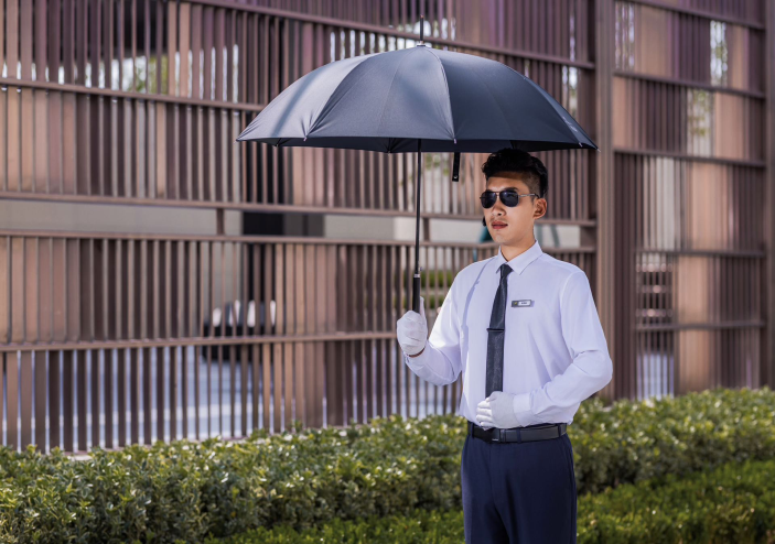 礼宾人员站姿、跨立、敬礼,每一个动作都铿锵有力,礼貌问询、停车指引、遮阳服务、雨停服务等,细致周到的礼宾服务让到来的每一位客户都感受到宾至如归的亲切感。